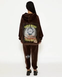 Lightweight velour fabric in luscious brown. Oversized boyfriend hoodie with exposed seams. This print is designed to crackle, just like your favorite vintage hoodie.Â