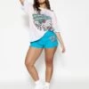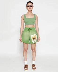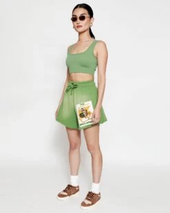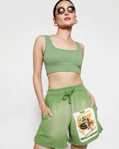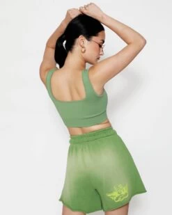 Lightweight french terry fabric in green with potassium spray. High-rise shorts with thick waistband, adjustable drawstring, side pockets, and raw edge hem. Features puff print detail.