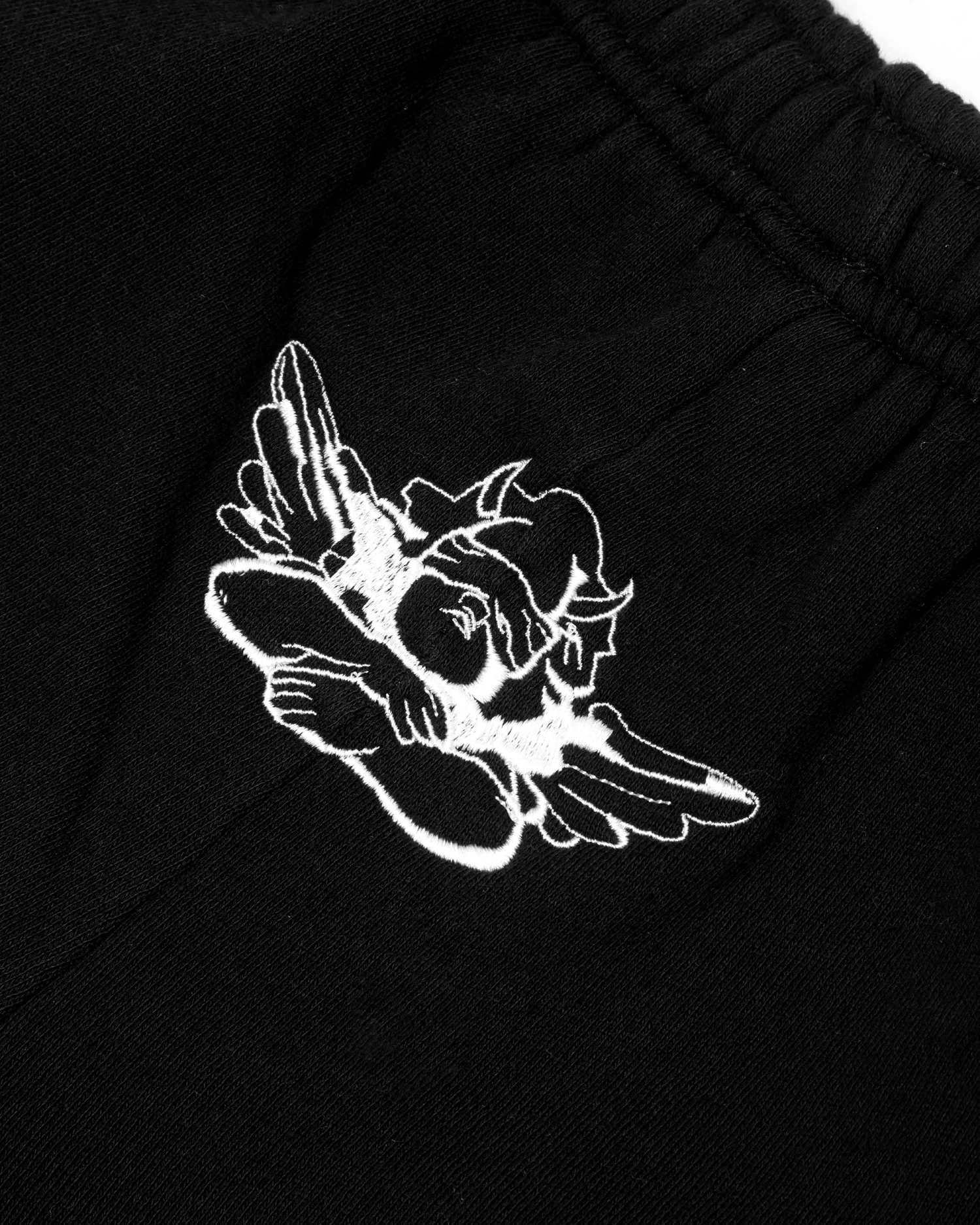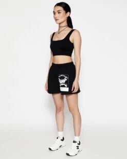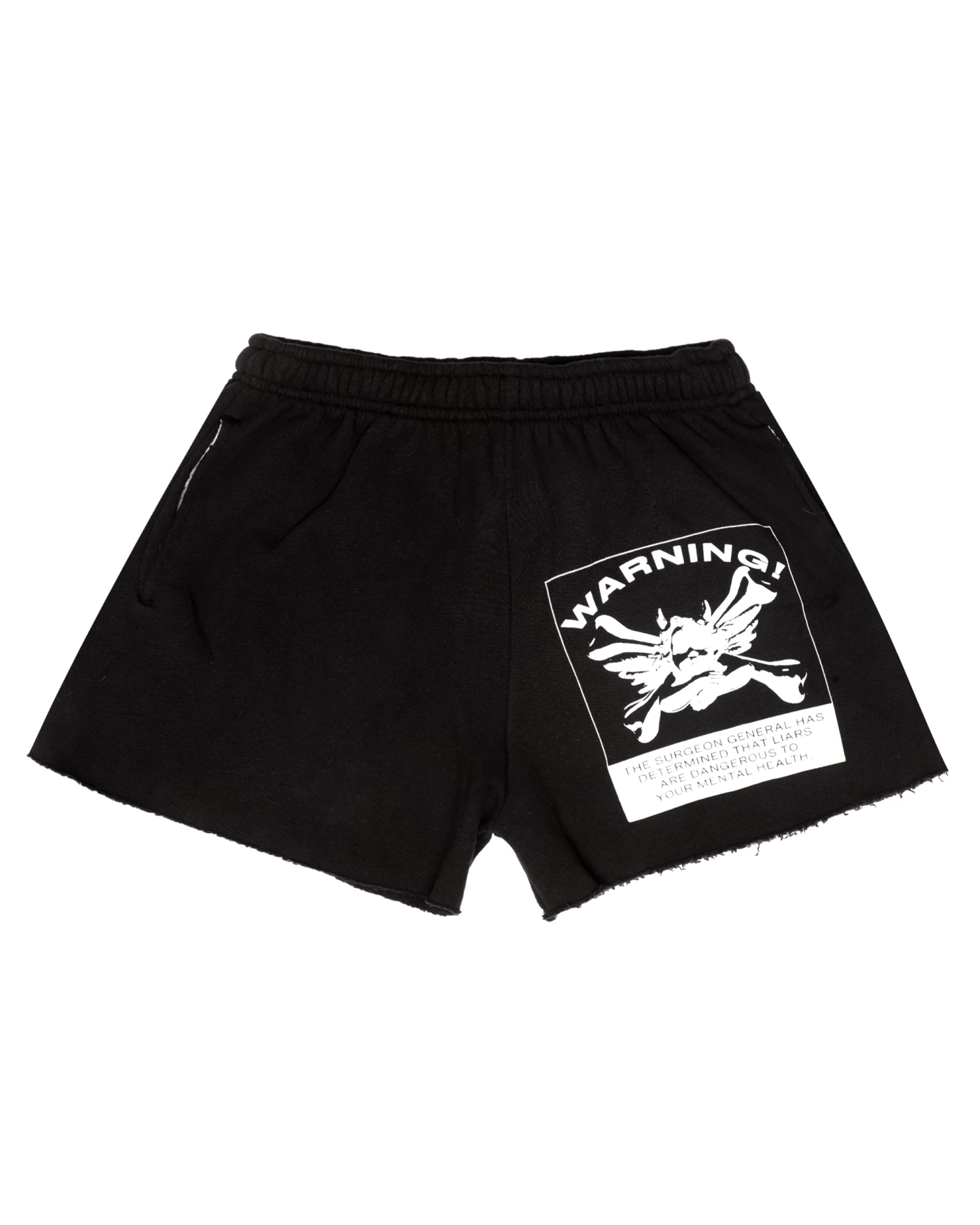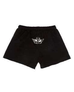 Fleece fabric in black. Mid-rise shorts with interior adjustable drawstring, side pockets, a raw edge hem, and embroidered logo.Â