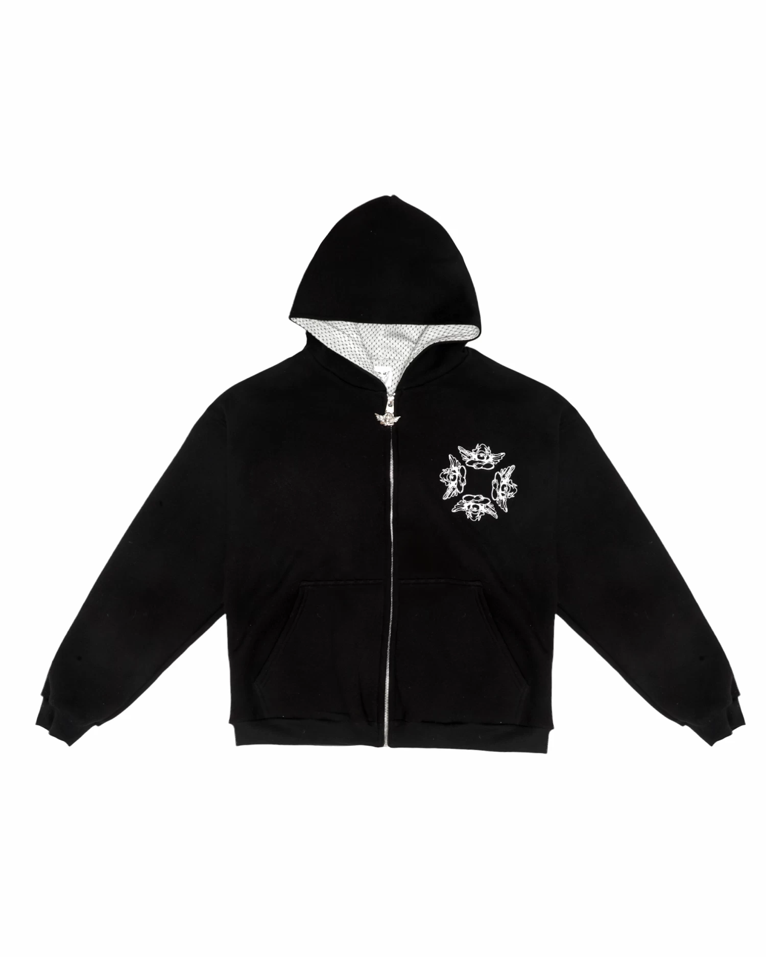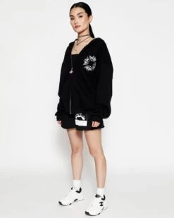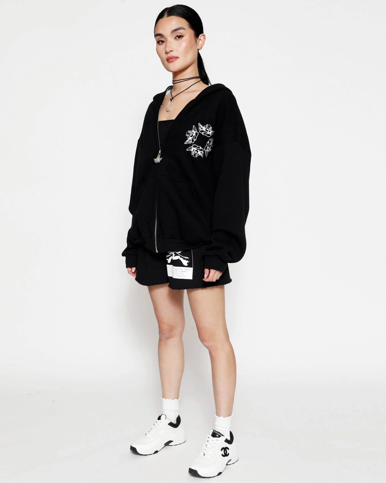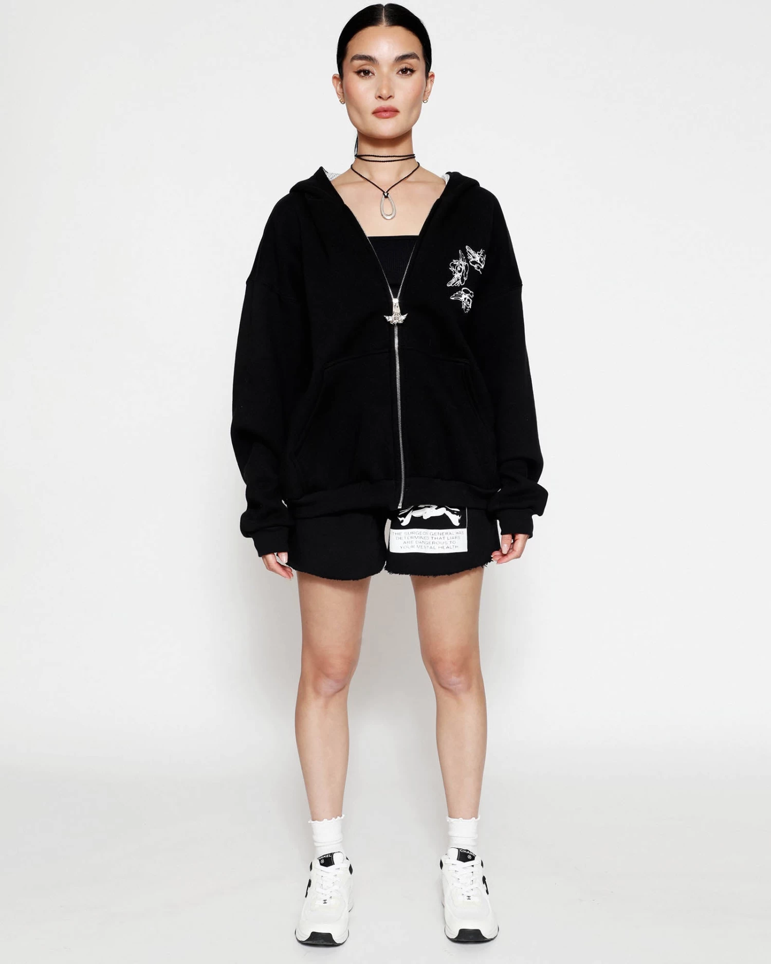 Fleece fabric in black. Oversized zip up hoodie with inside lining, front pockets, and ribbed cuffs. Features extra large Boys Lie logo zipper pull and embroidered logos.