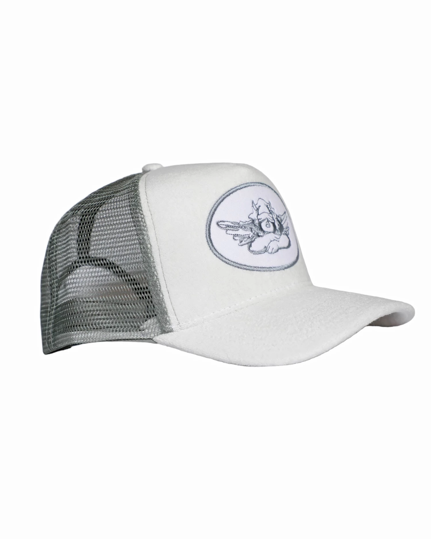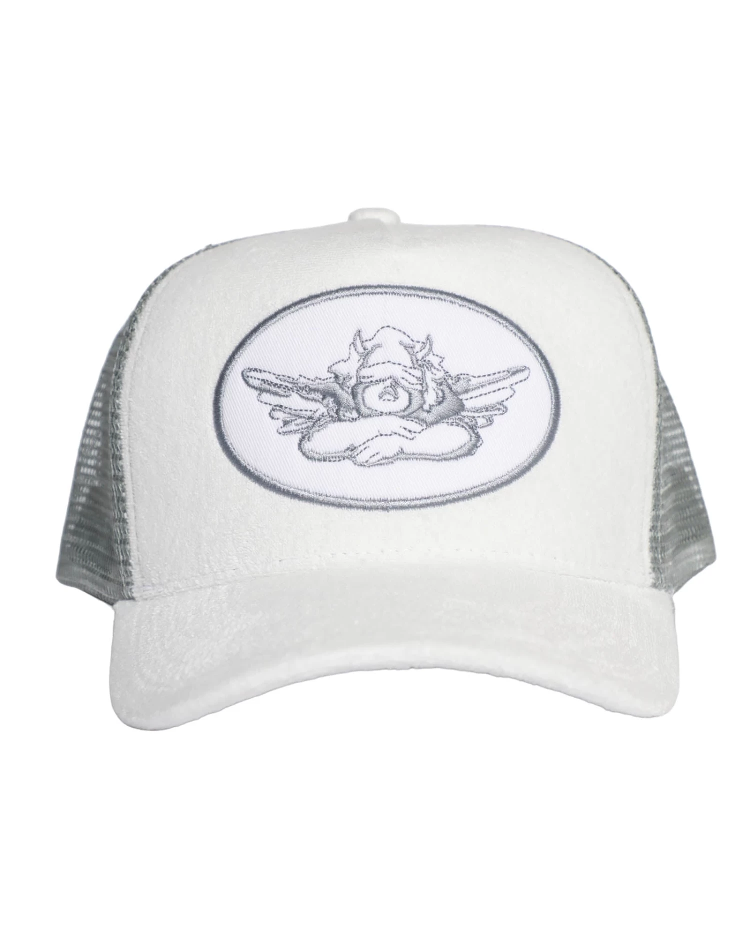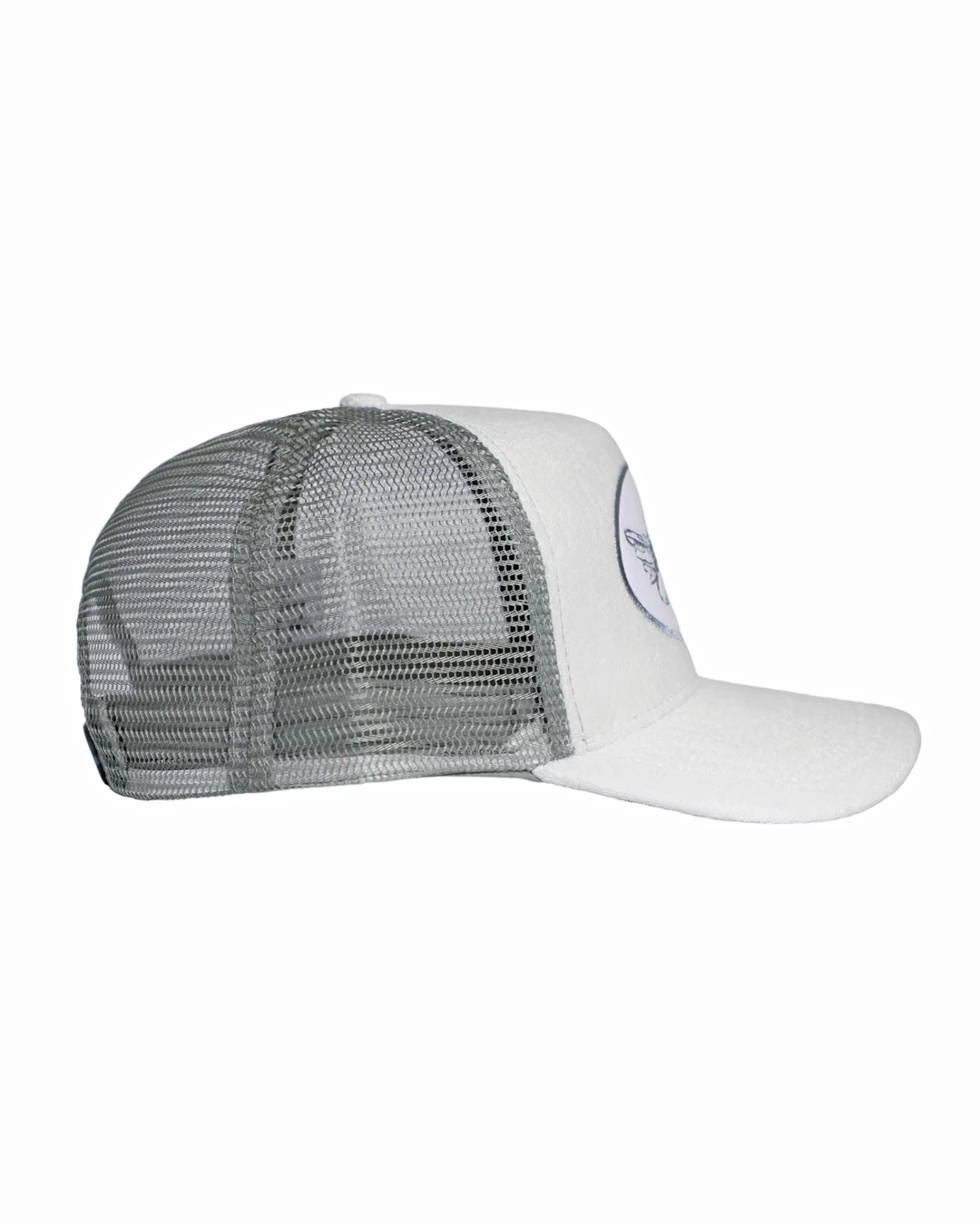 Grey trucker hat with white patch and white terry cloth. Adjustable snapback. Â