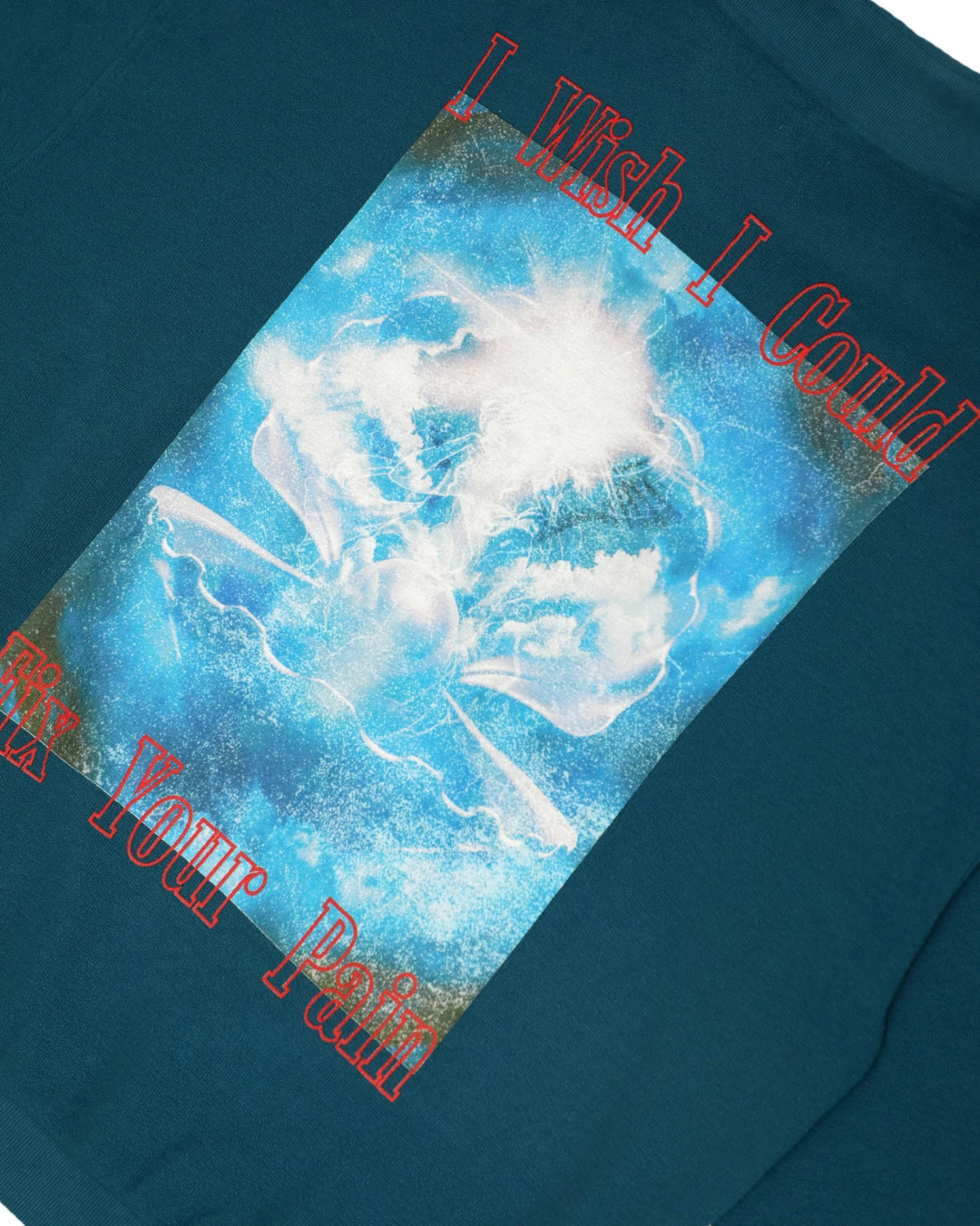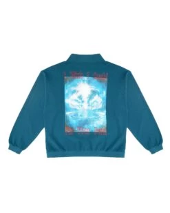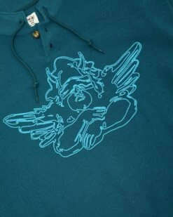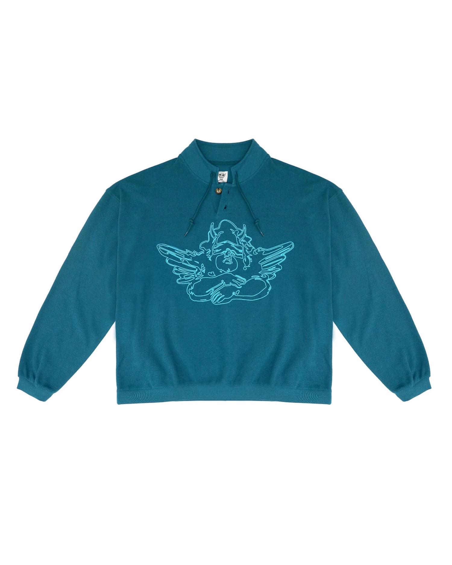 Inside out french terry fabric in teal. Henley style crewneck with button details, drawstring, and ribbed cuffs and hem.Â