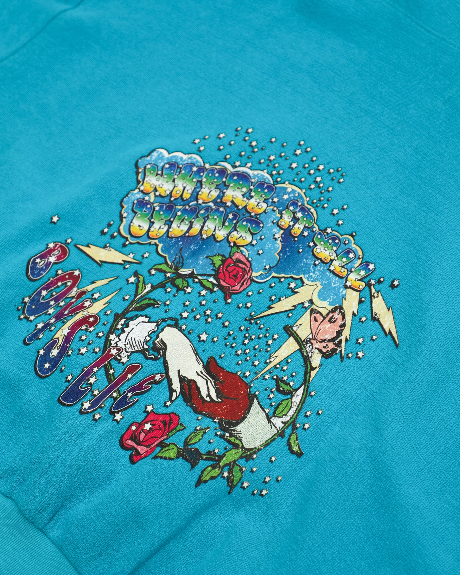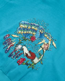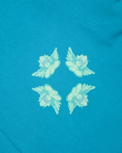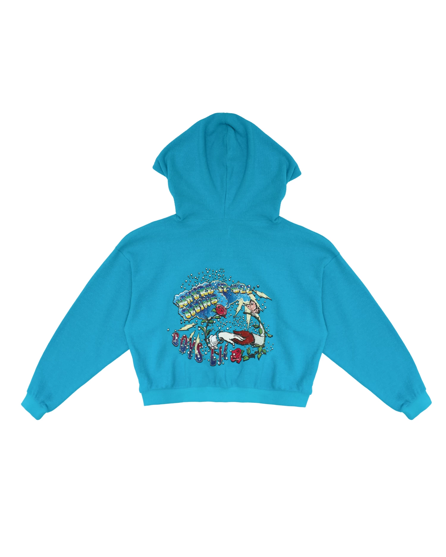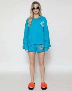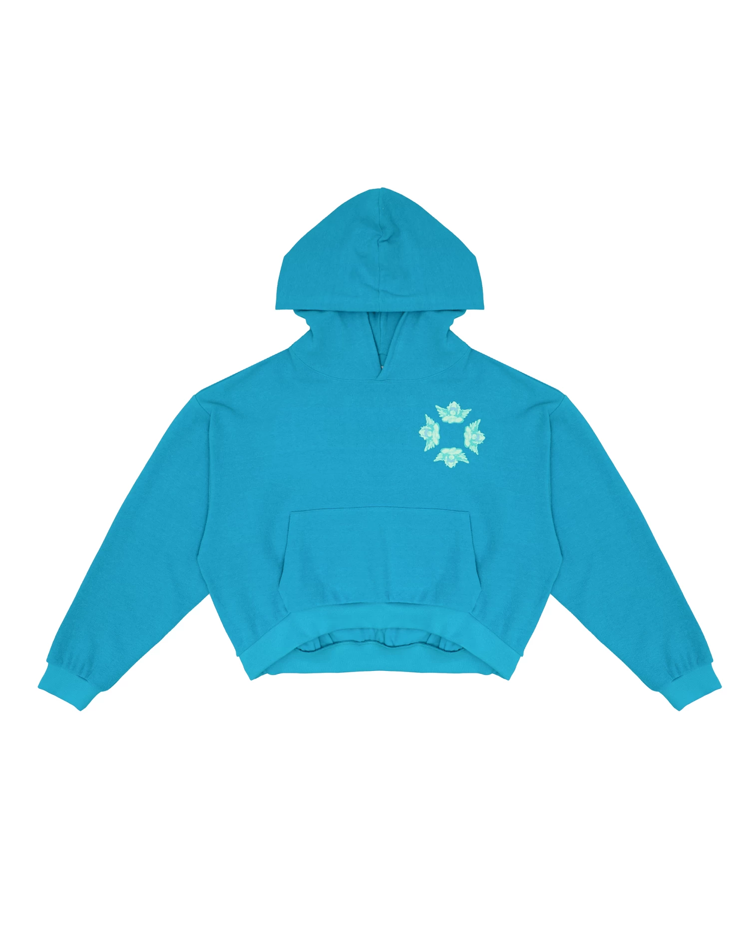 Inside out french terry fabric in turquoise blue. Oversized cropped hoodie featuring a dramatic hood, front pocket, and slightly curved front hem.Â