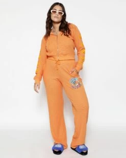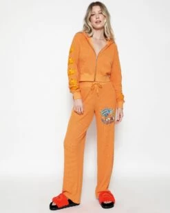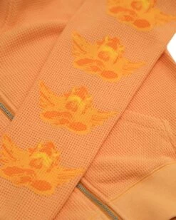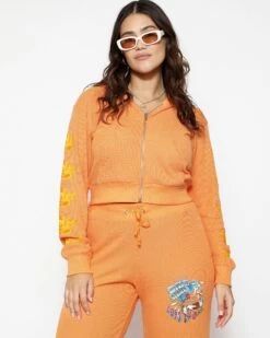 Super soft thermal fabric in bright orange. Zip up hoodie with cropped hem, front pockets, and ribbed cuffs.Â