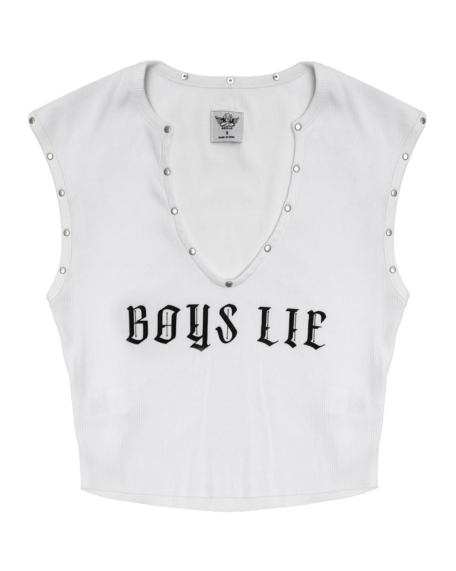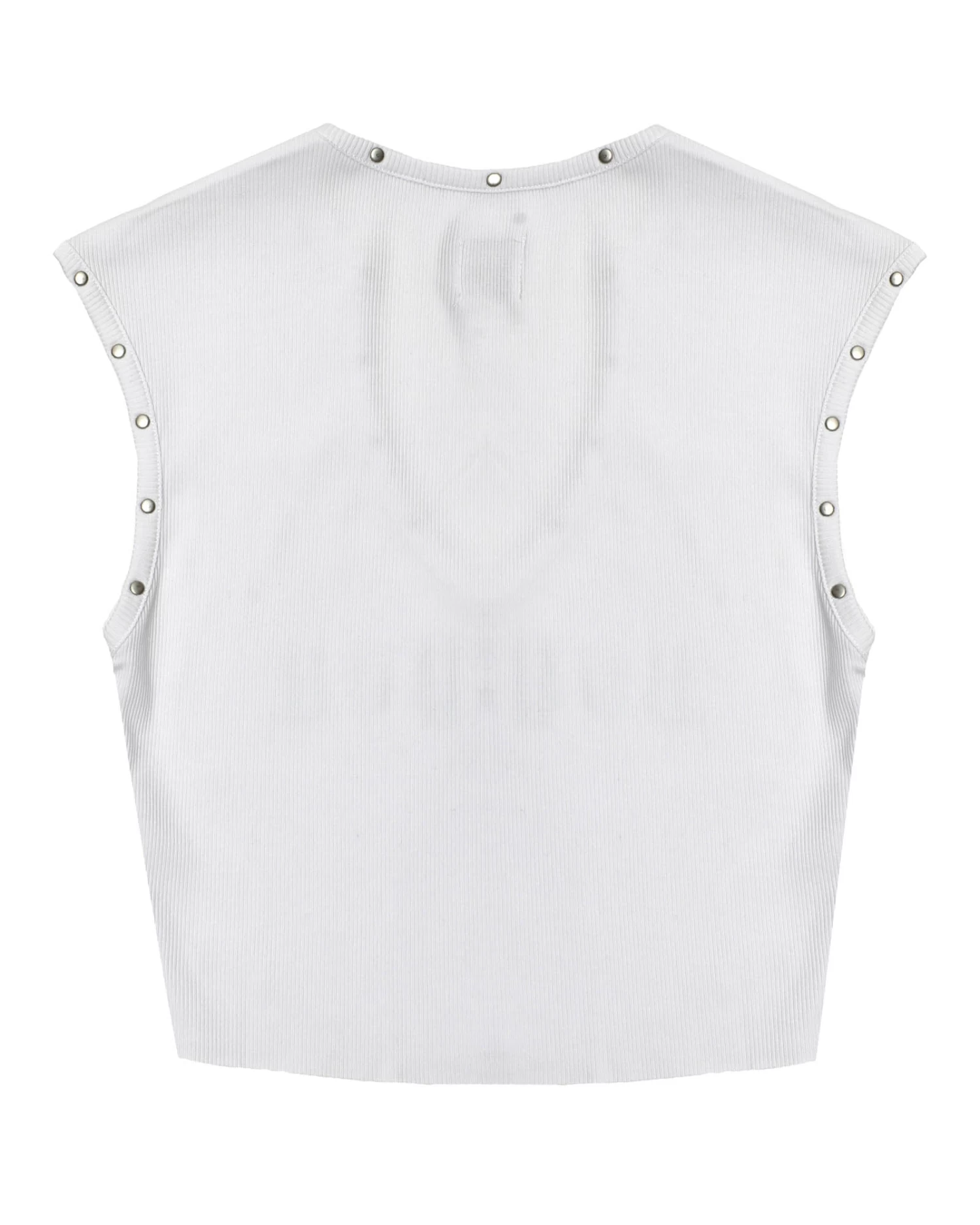 Blue ribbed crop tank with a V neckline and silver stud details.Â