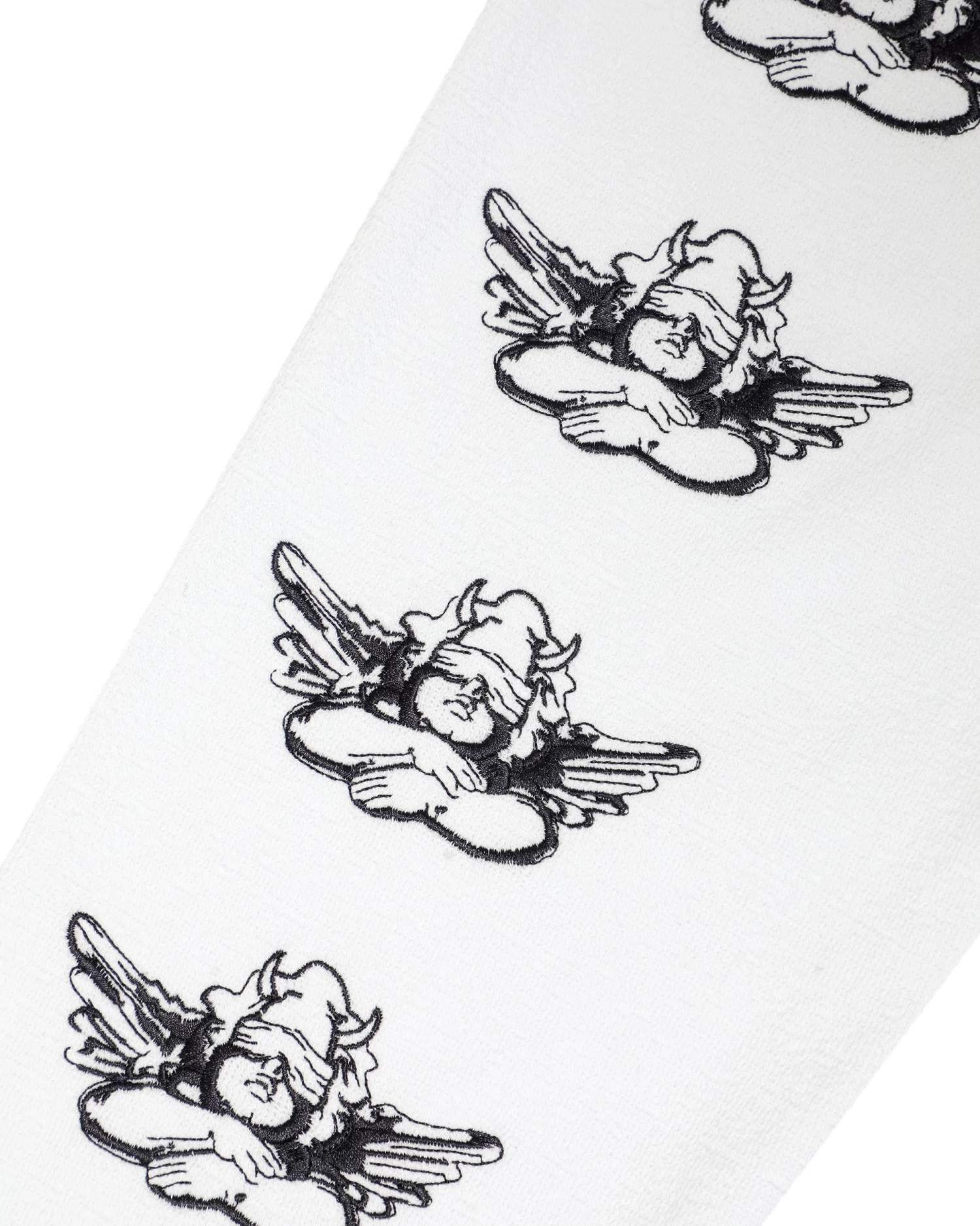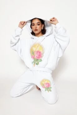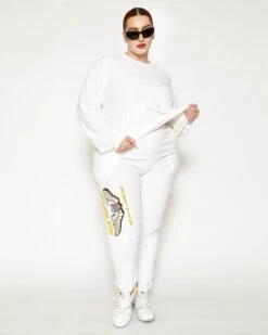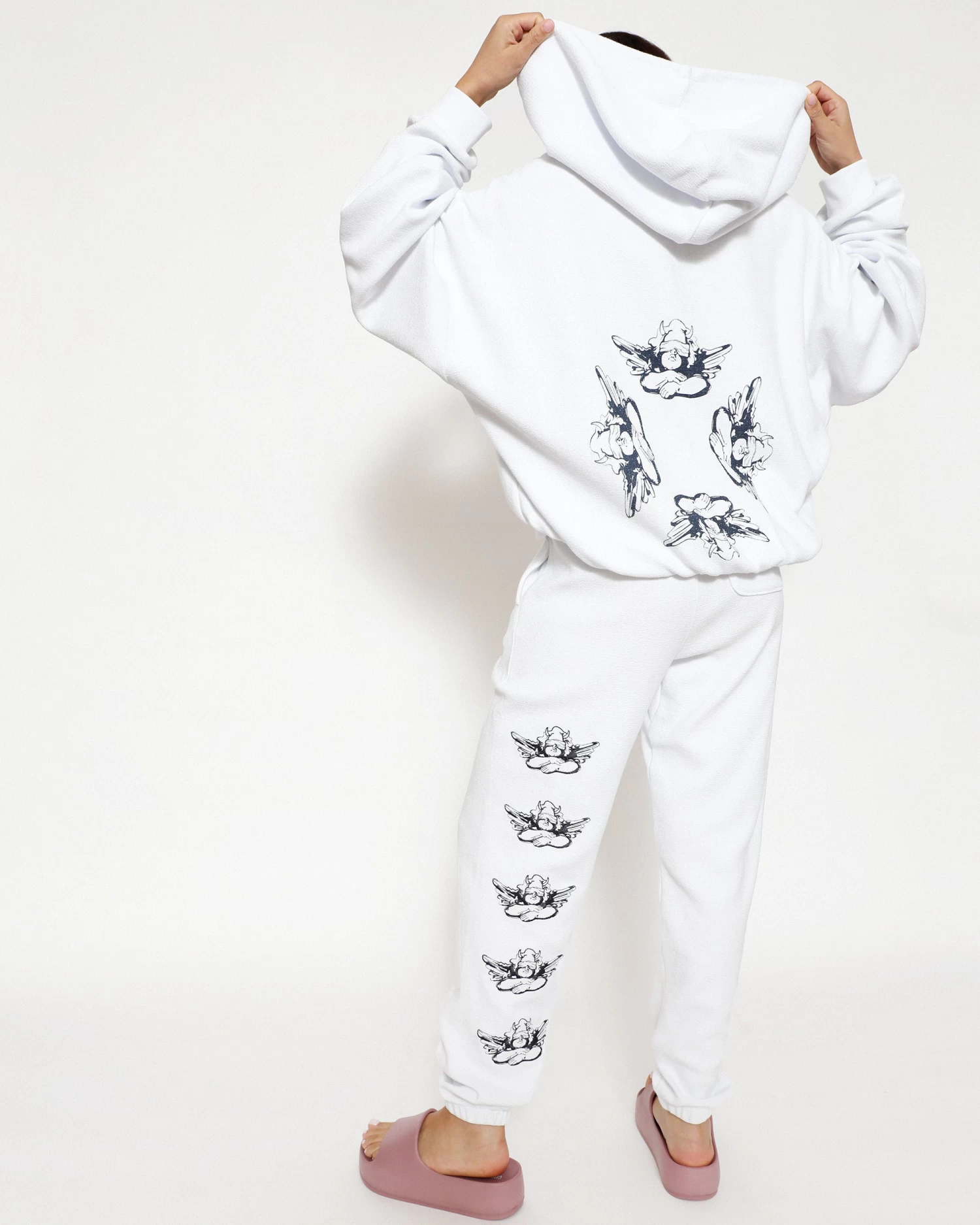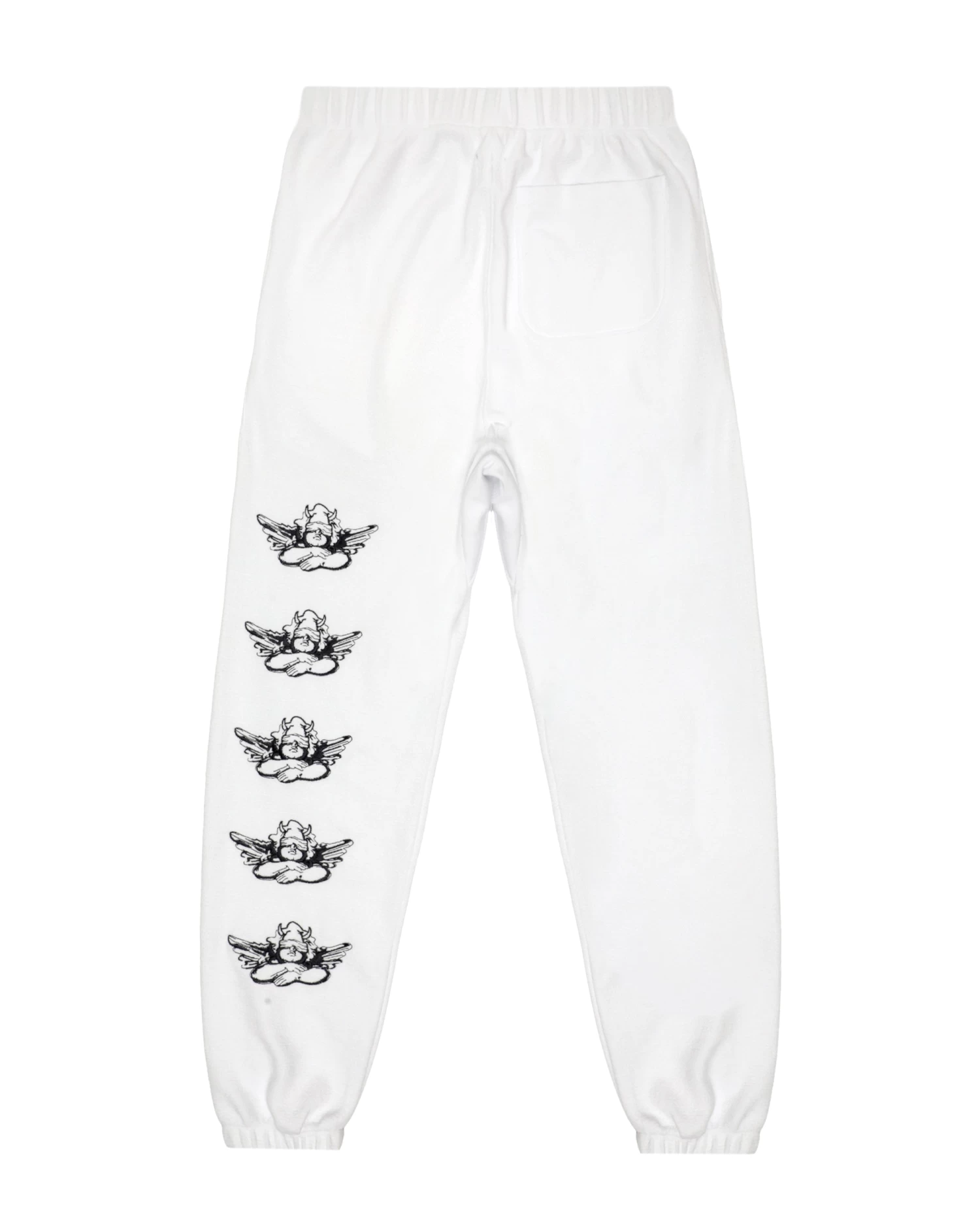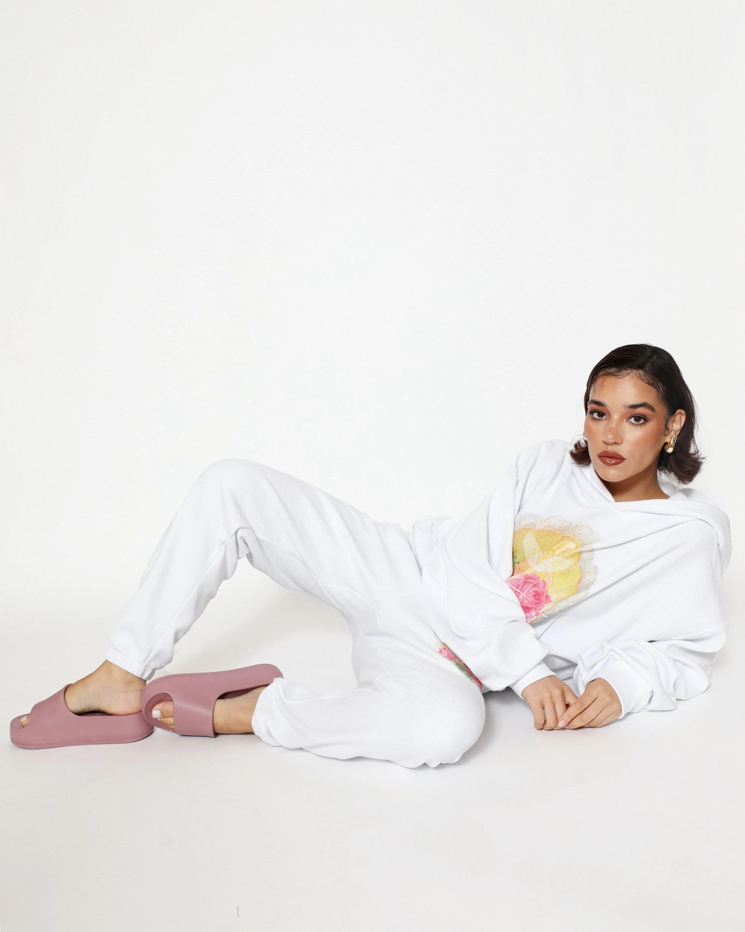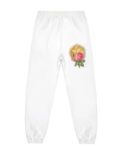 Inside out french terry in white. High rise sweatpants with back and side pockets, elastic waistband and cuffs. Embroidered back logos.Â