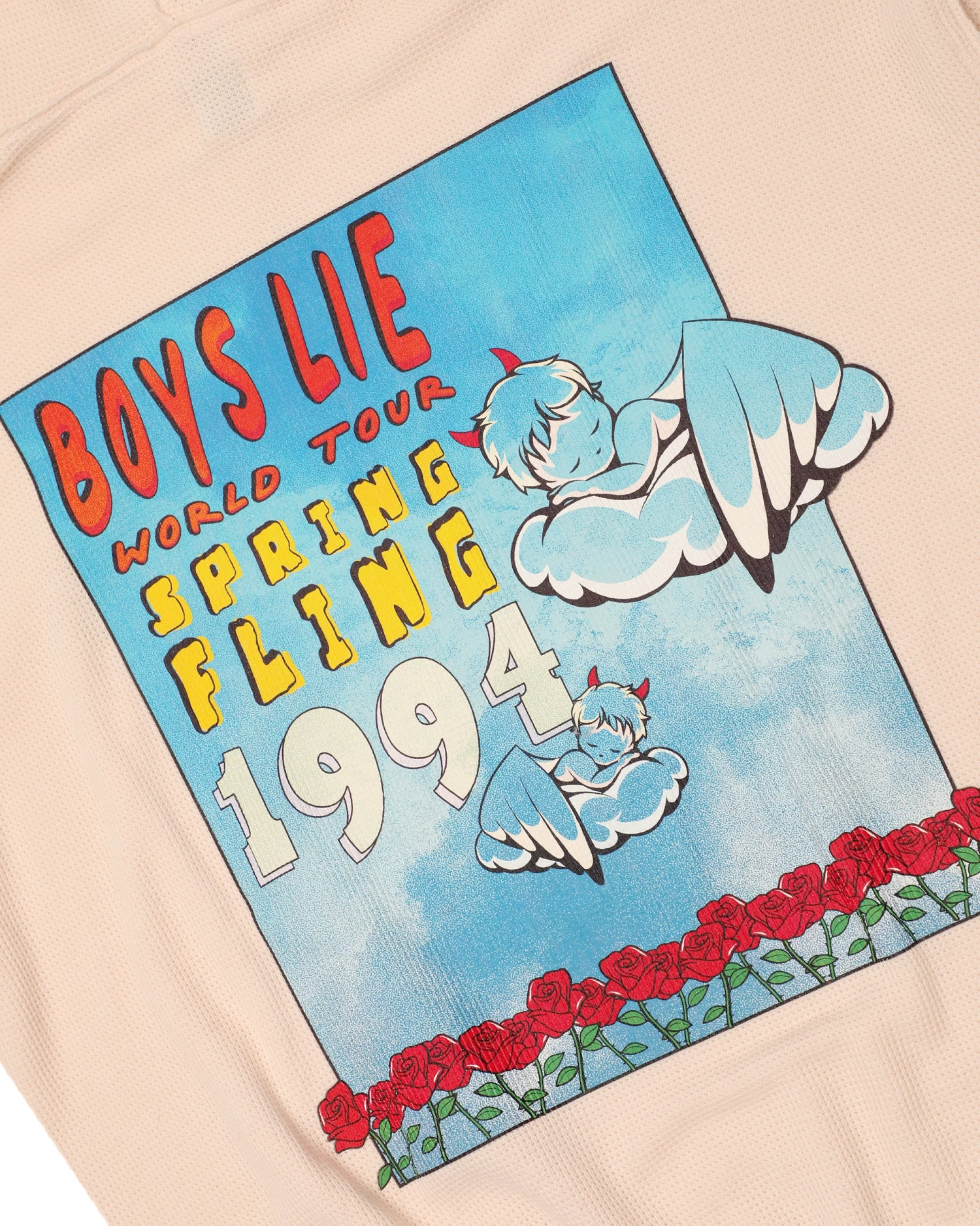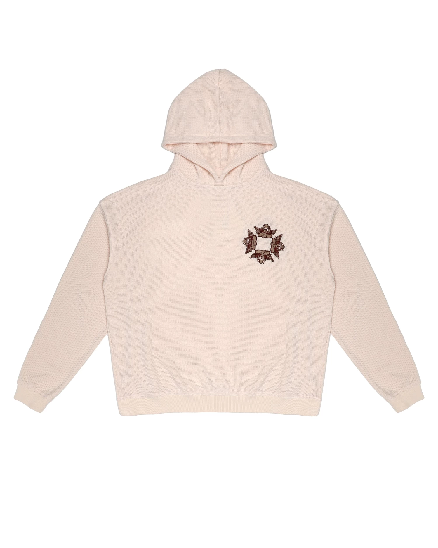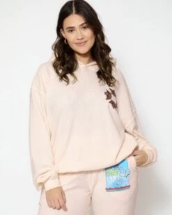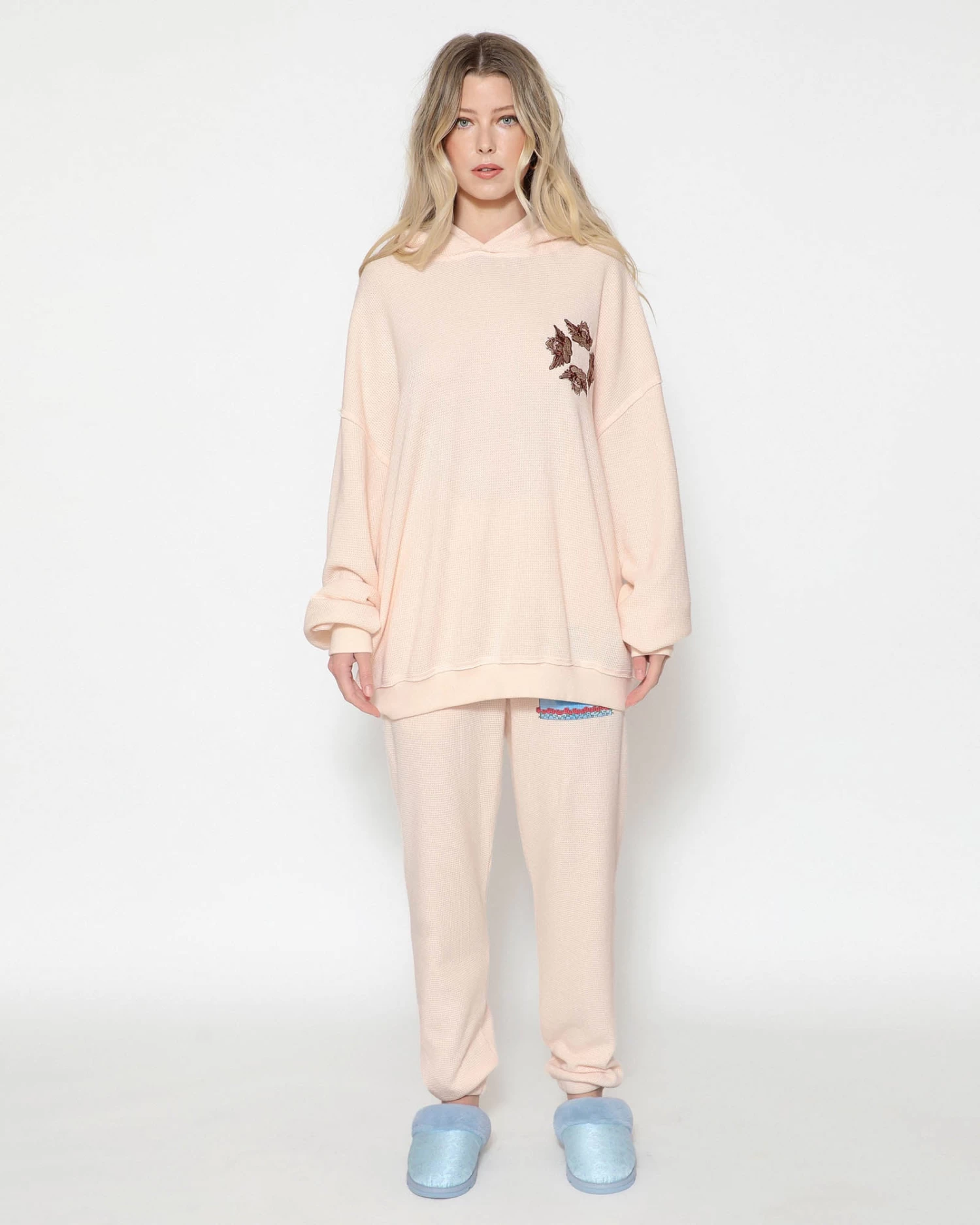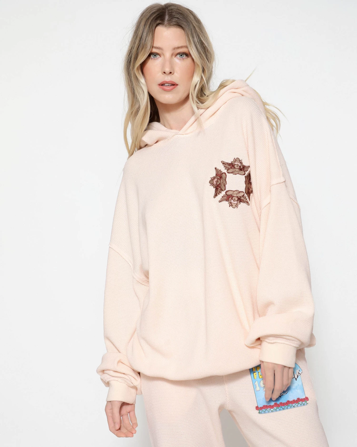 Super soft thermal hoodie in peach featuring exposed seams and a boyfriend fit. Embroidered front logos.Â
