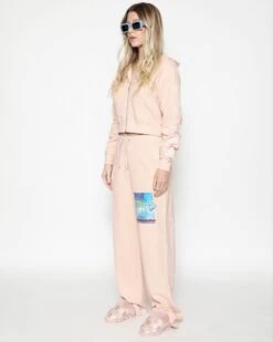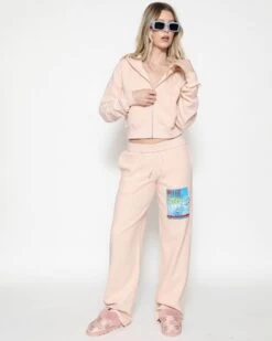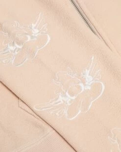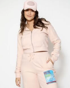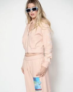 Lightweight inside out french terry fabric in a soft pink. Zip up hoodie with cropped hem, front pockets, and ribbed cuffs. Features embroidery on the sleeves.Â