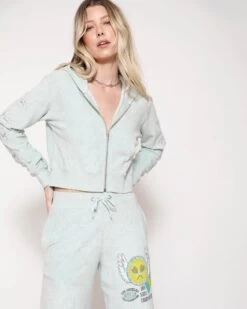 Lightweight inside out french terry fabric in a soft pink. Zip up hoodie with cropped hem, front pockets, and ribbed cuffs. Features embroidery on the sleeves.Â